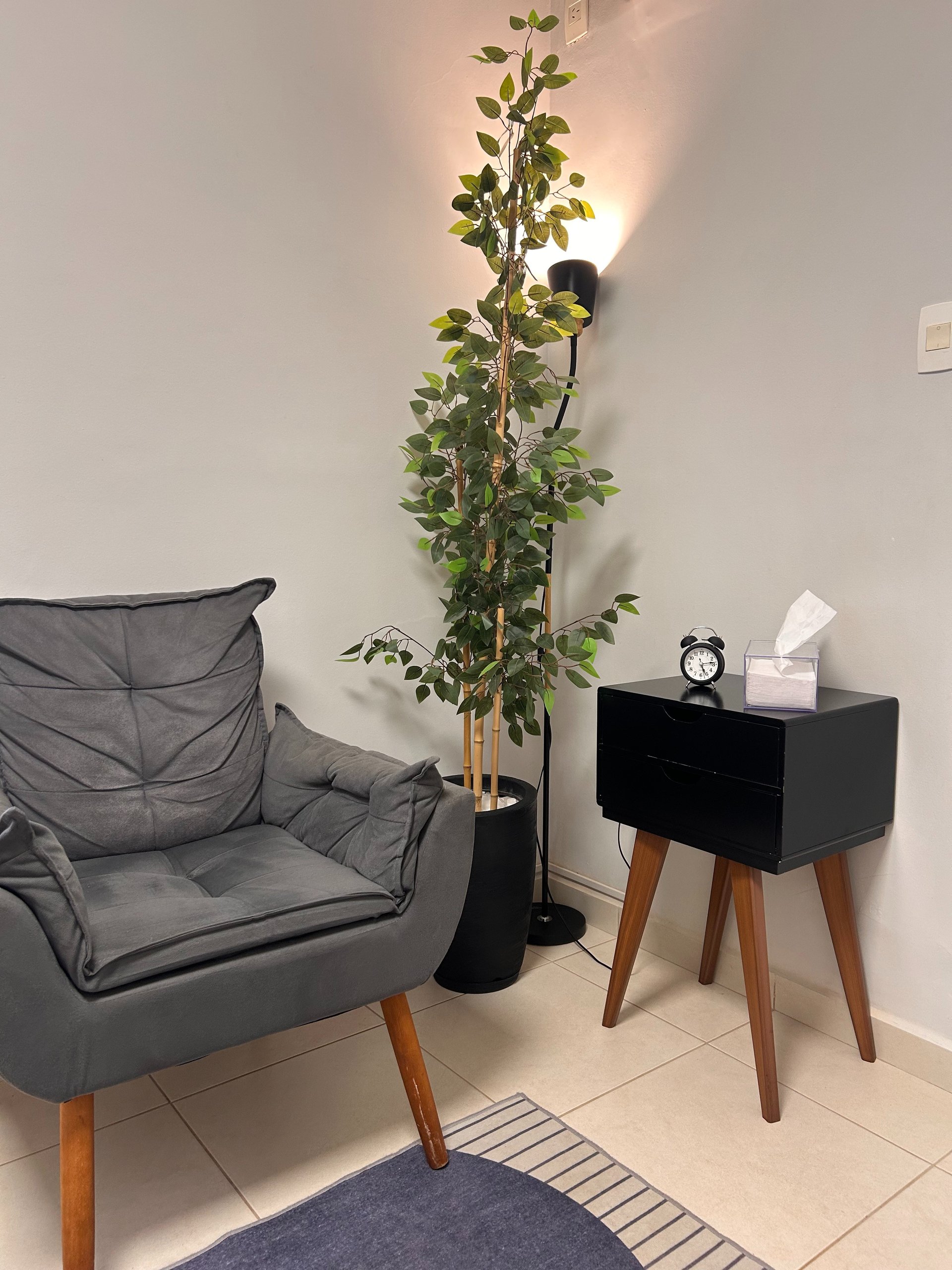 Poltronas confortáveis, tapetes que tornam o espaço mais humano, iluminação indireta, climatização e pequenos detalhes que fazem diferença — como lenço disponível na sala.