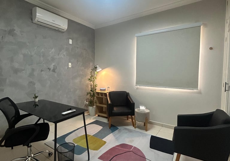 Casa comercial adaptada para atendimento clínico, com ambiente acolhedor, paredes estruturais que garantem a privacidade e controle de iluminação para diferentes estilos de atendimento.